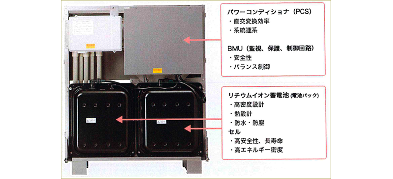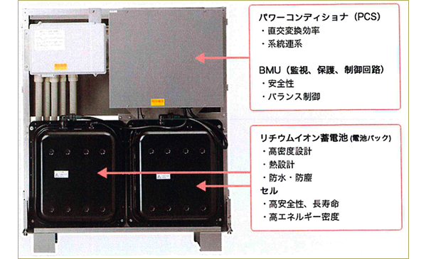 家庭用蓄電池のカット写真を見ると、箱の中に蓄電池とパワコンが入っているのがわかります。