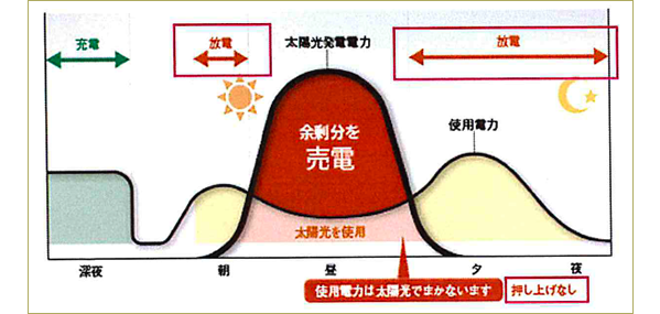 日中太陽光で発電した電力を売らないで、蓄電池に貯めて他の時間に使用するという使い方です。