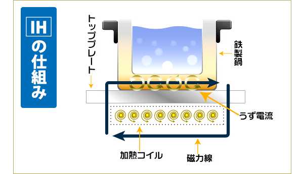 このうず電流がそのものを発熱させます。したがって熱効率が良く、立ち上がりが早く、強い火力を得られます。