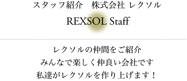 株式会社レクソルは、みんなで知恵を出し合い協力し合い助け合い、チームのような会社です。 誰ひとり、孤独じゃない、常に共に考える、動く、形をつくる。 これを原点にもっとお客様にご満足いただけることは何か? 会社発展の為にどう先を考えるか? みんなで一つの志に向かって進んでいます。 私たちは、沢山のお客様との出会い、そして日々お世話になっています 取引先各位様への感謝の気持ちでいっぱいです。 これからも頑張りますので、宜しくお願いします。 スタッフ一同