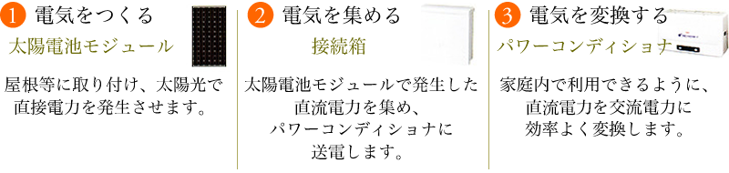 太陽光発電システムは、日の出により日射が始まるとともに自動的に運転を開始し、日没で日射量が無くなるととともに自動的に停止します。 したがってお客様の操作は一切不要です。 |